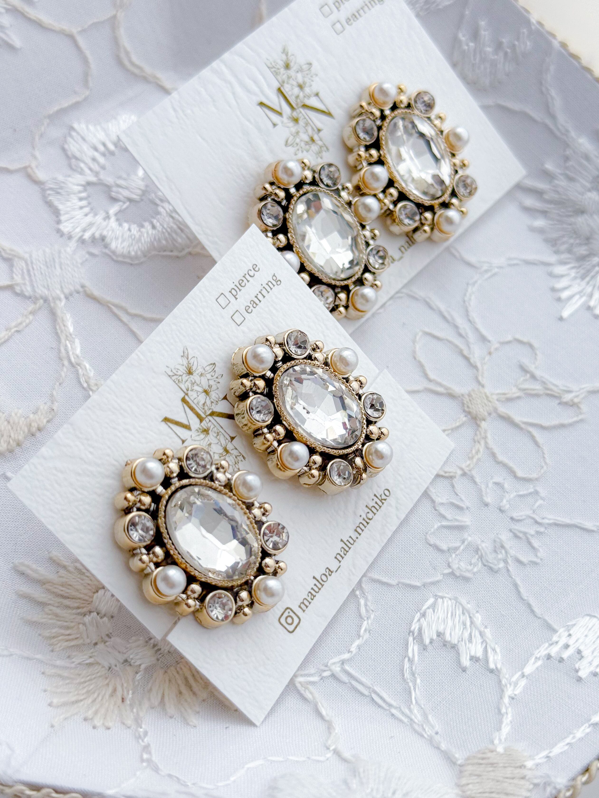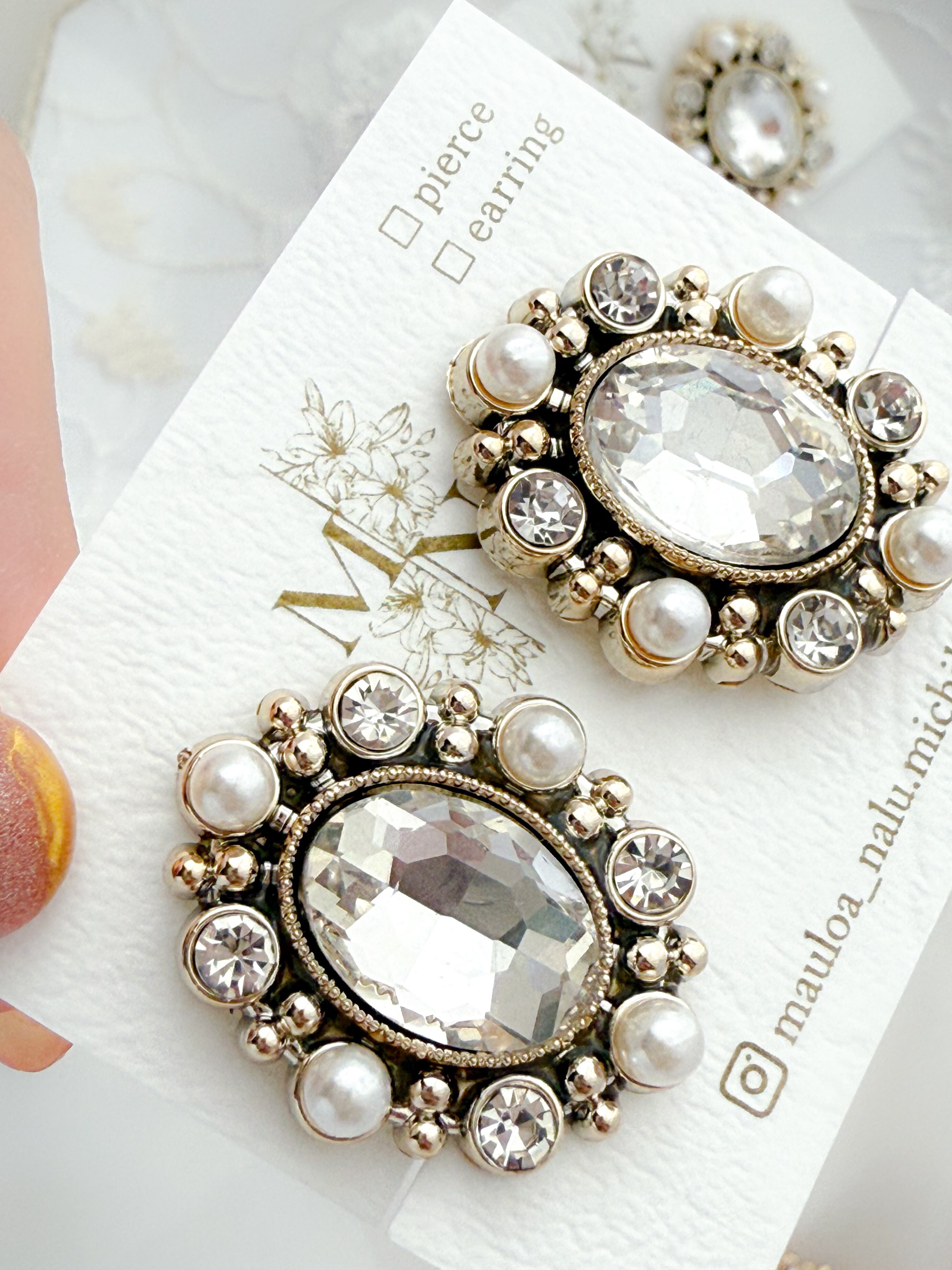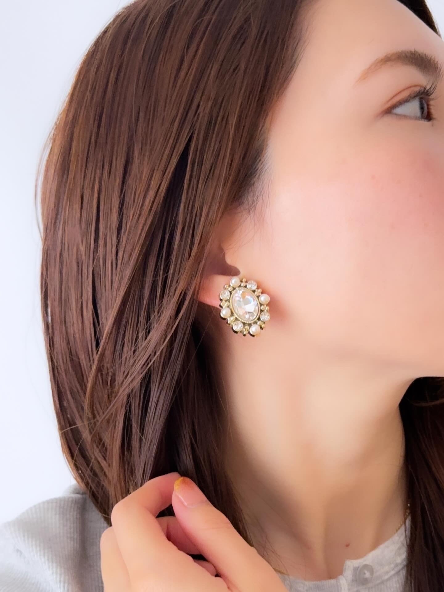 オーバルのクリスタルを中心に、上品なパールを贅沢にあしらった