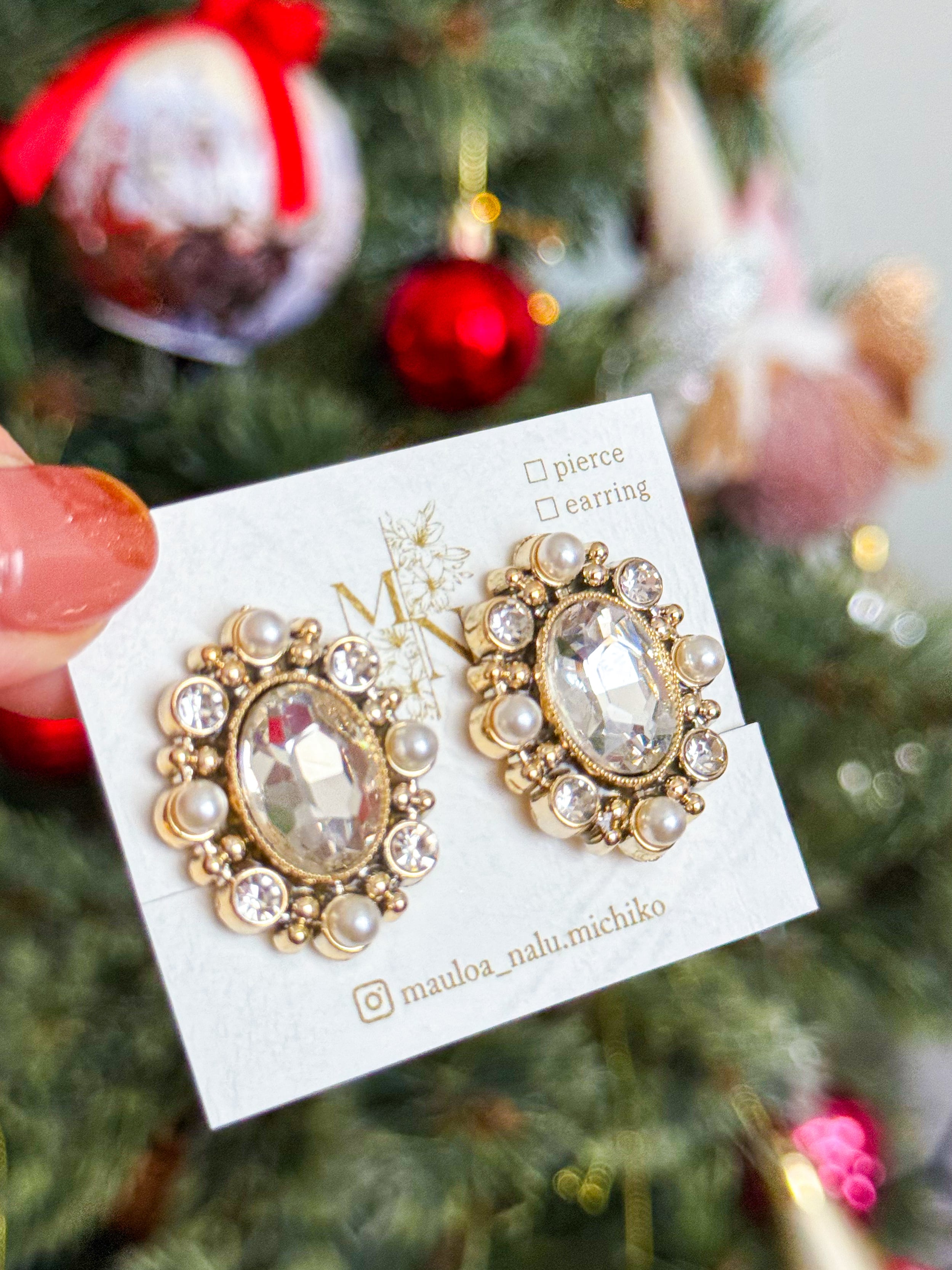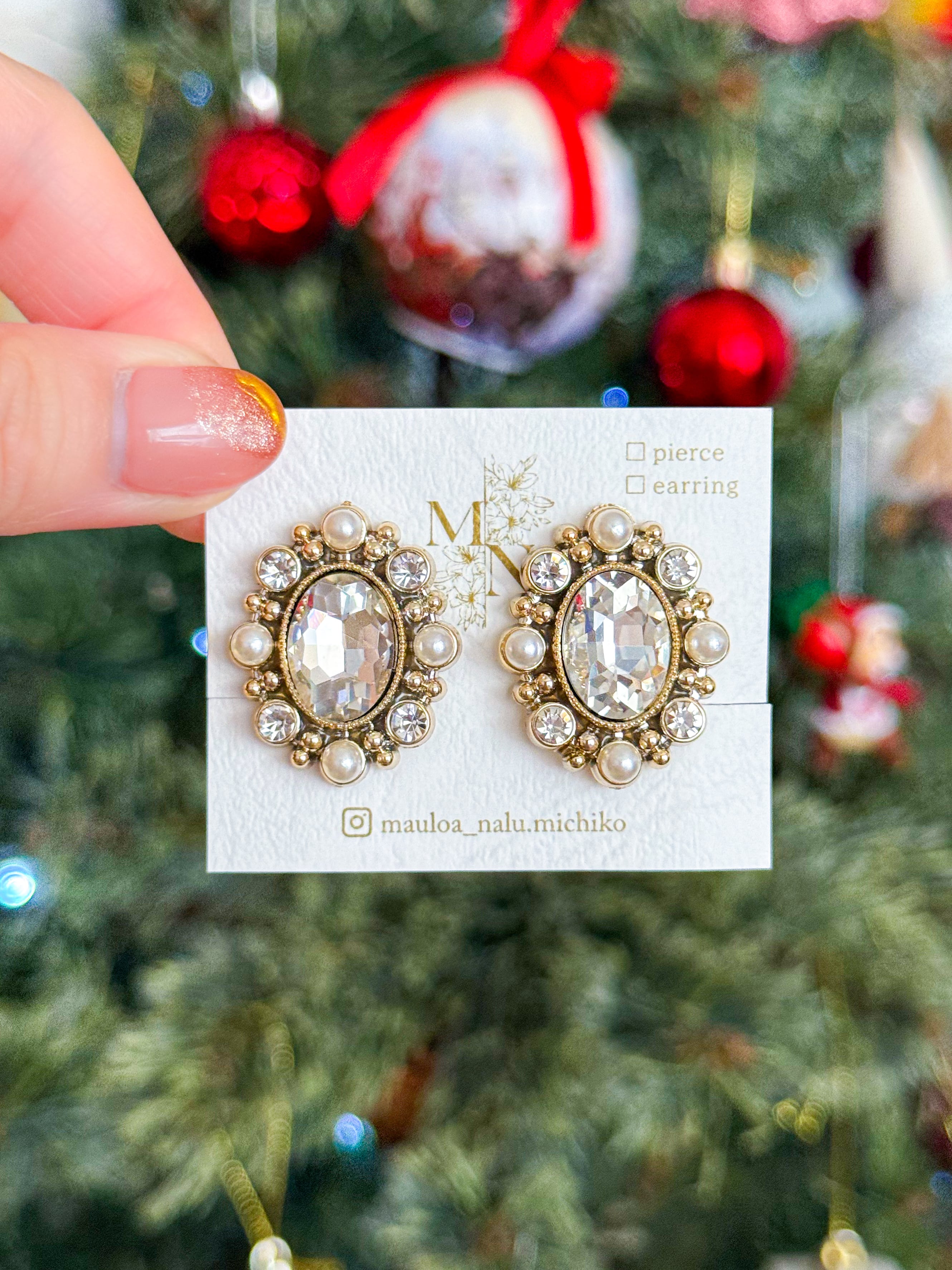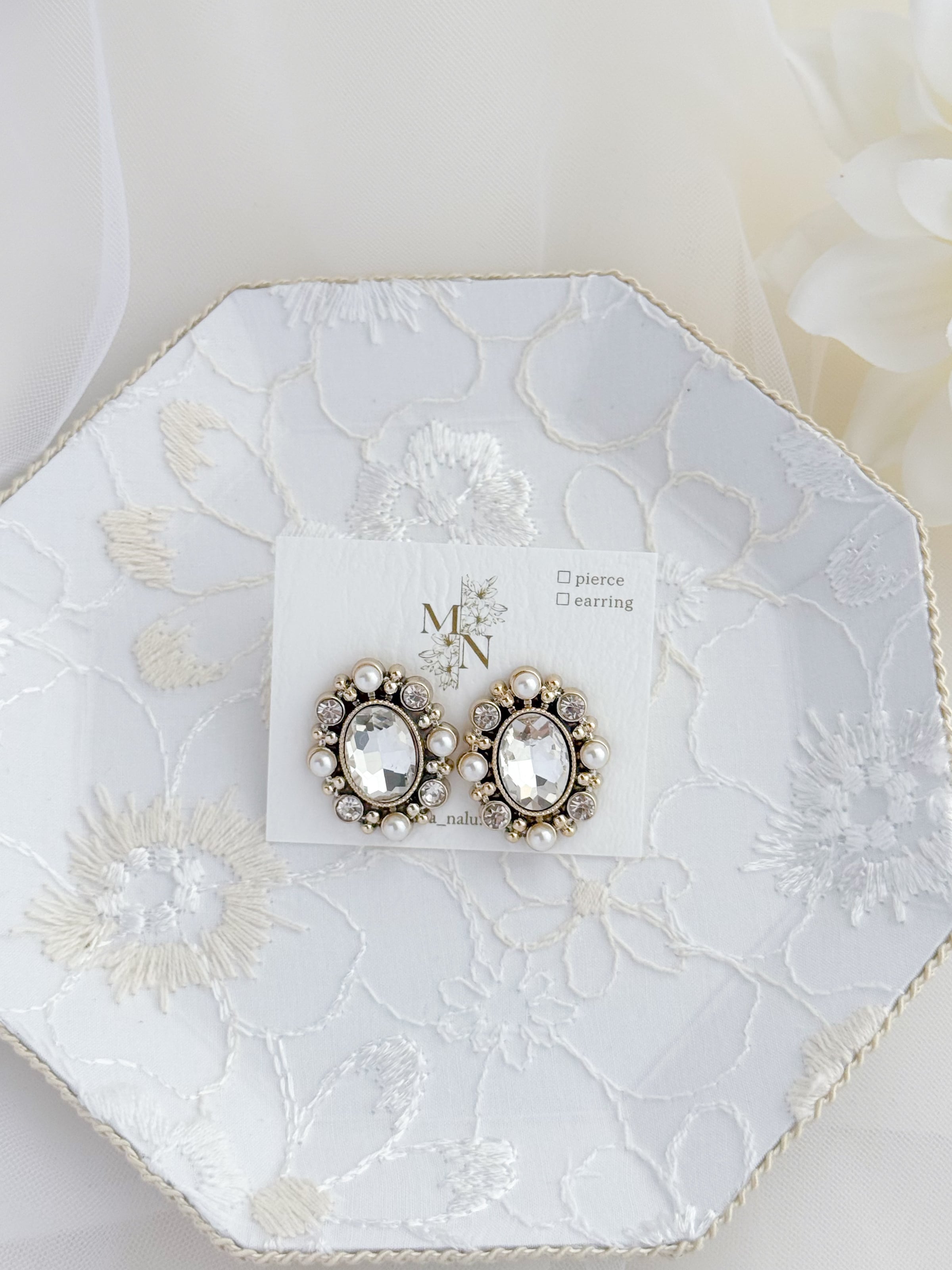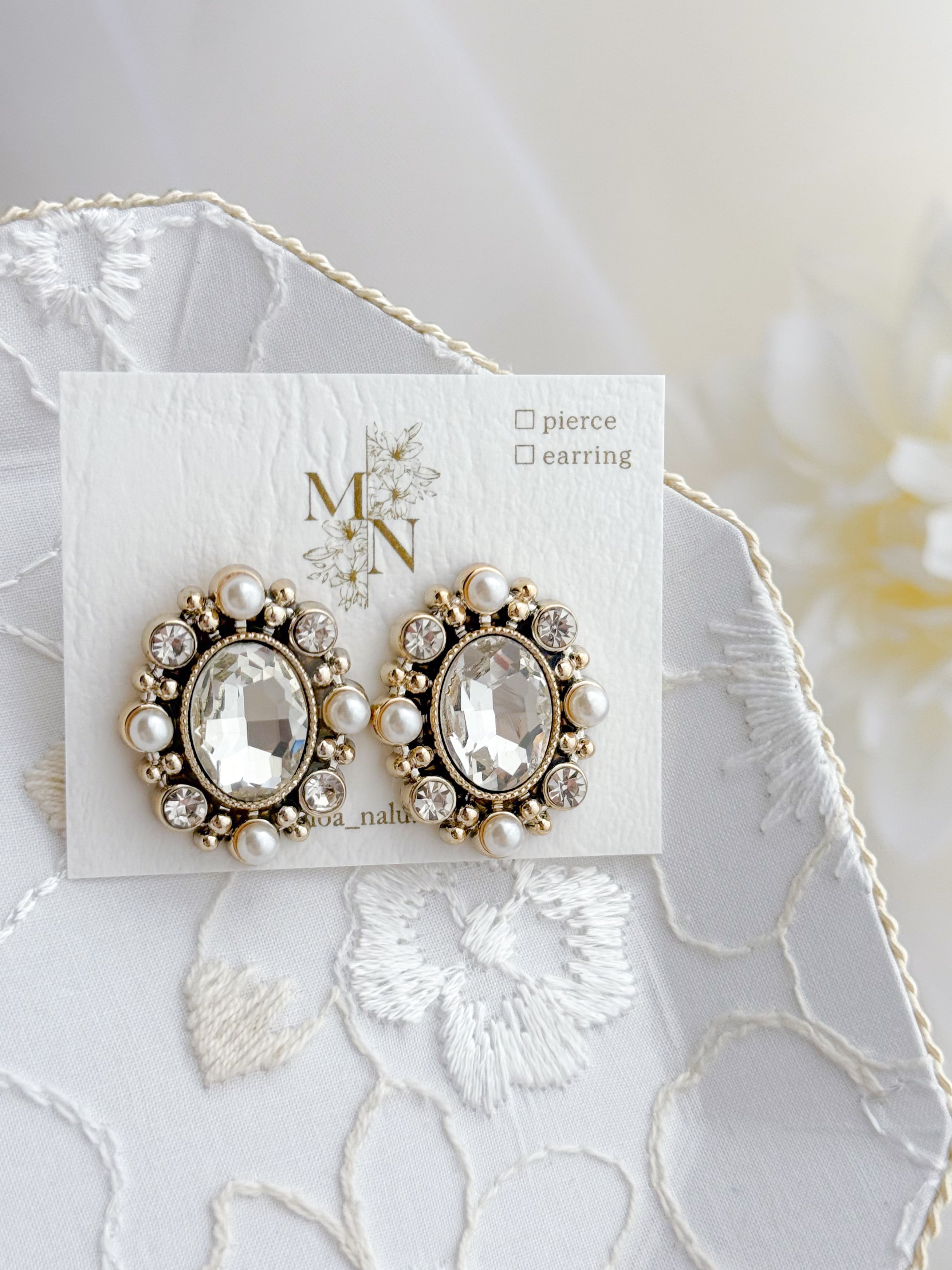 オーバルのクリスタルを中心に、上品なパールを贅沢にあしらった