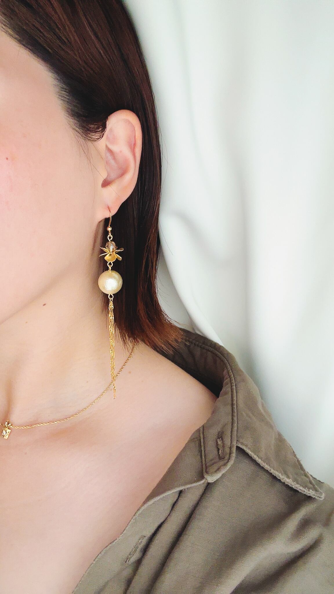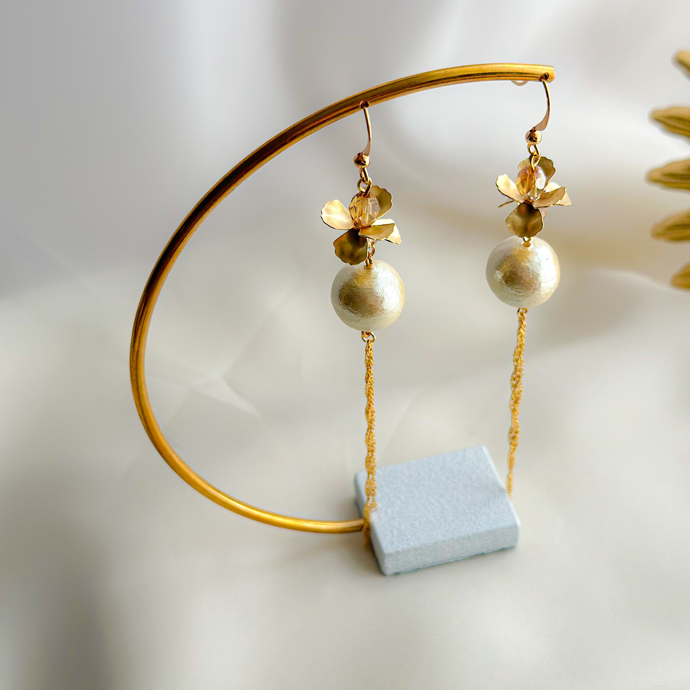 ☆ キスカ色のコットンパールが可愛いマットゴールドフラワーとチェーンが揺れるピアス/イヤリング