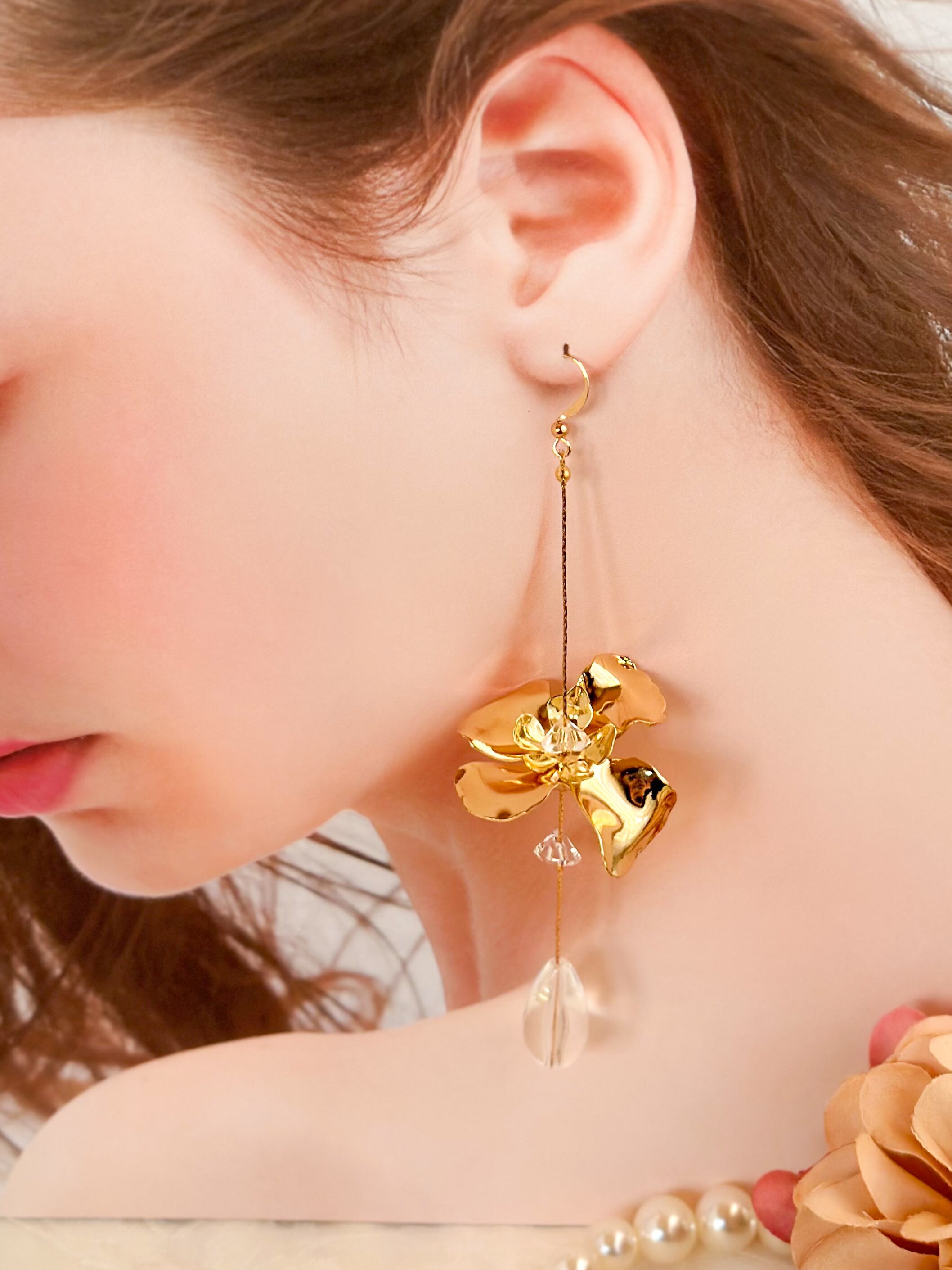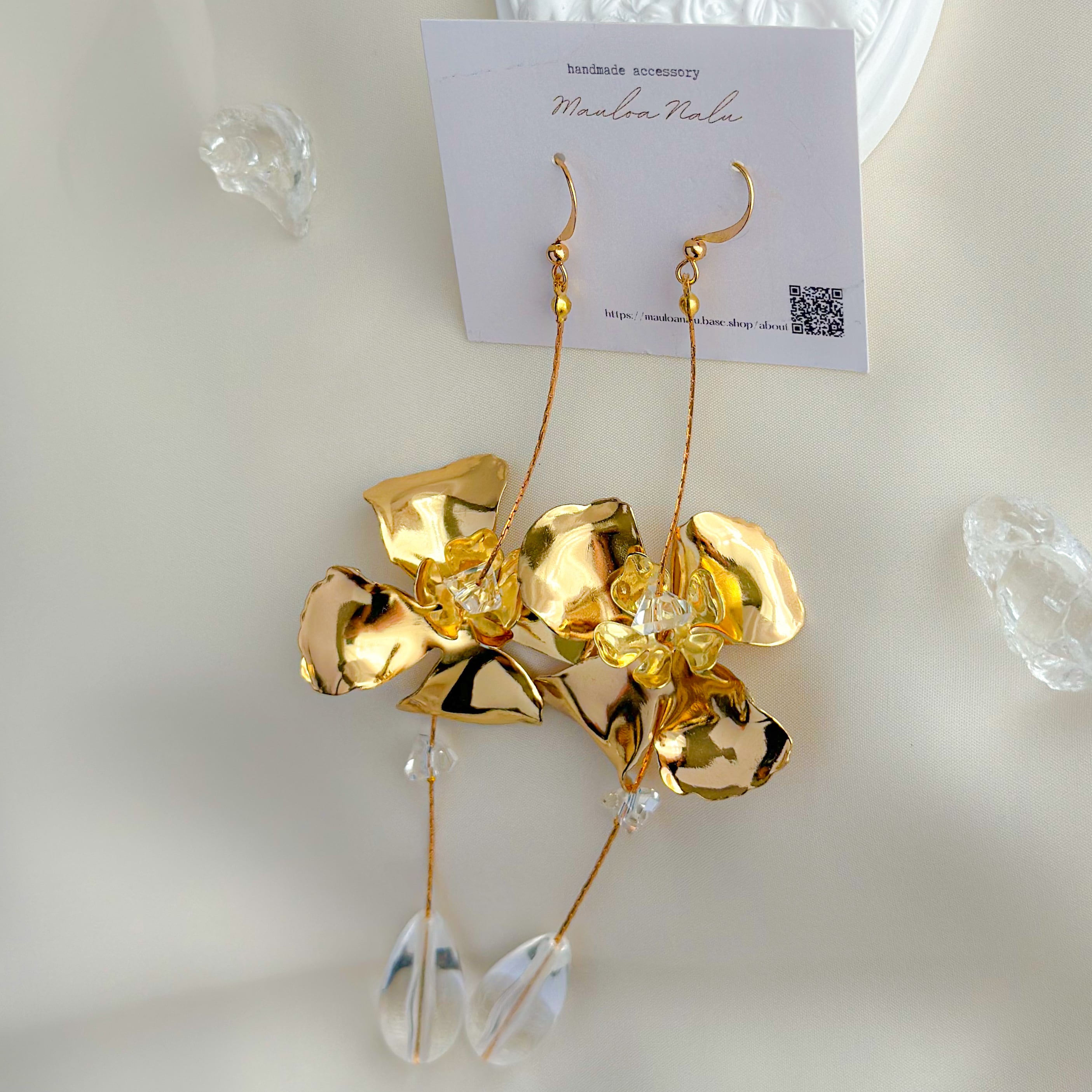 ☆ まるでシャンデリアのような ゴールドフラワーにクリアビーズが揺れるピアス/イヤリング